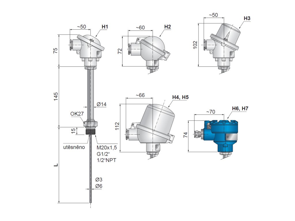 Snímače mohou být dodány s připojovací svorkovnicí nebo s převodníkem s výstupem 4 až 20 mA, případně HART, Profibus, Fieldbus umístěným v hlavici snímače.
